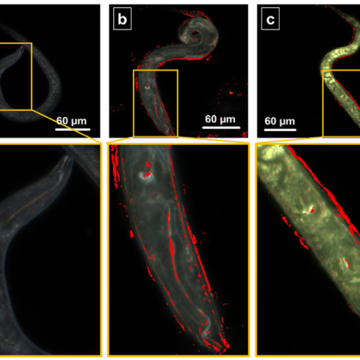 Imagens de microscopia hiperespectral de campo escuro (EDHM) do nematóide modelo C. elegans: a) controle; b) expostos ao oxido de grafeno e c) expostos ao óxido de grafeno degradado. Os pontos vermelhos indicam os materiais de grafeno aderidos na cutícula e intestino do organismo após 24 horas de exposição.